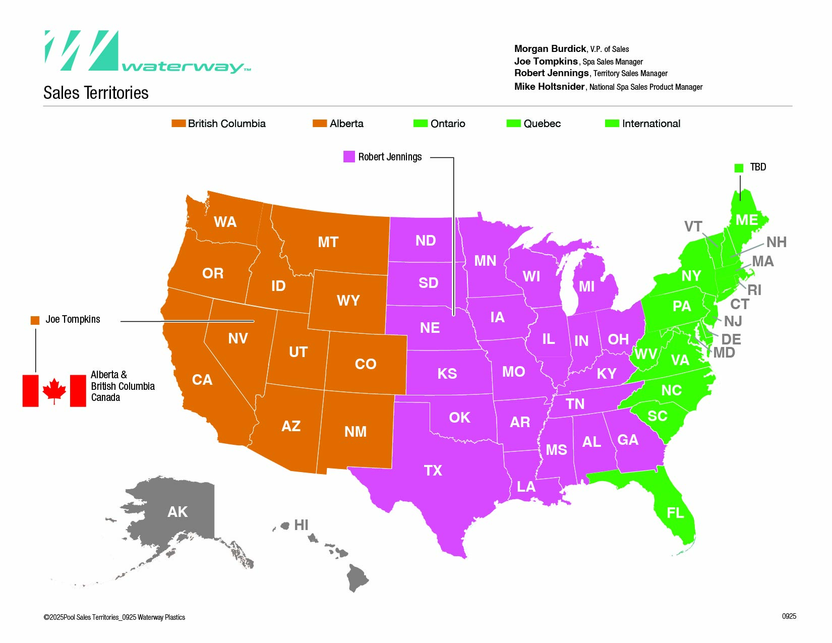 | Joe Tompkins | Spa Sales Manager | CA, NV, UT, OR, WA, ID, MT, WY, CO, AZ, NM, Alberta, British Columbia, Canada | Cell: (425) 241-9599 | joet@waterwayplastics.com |